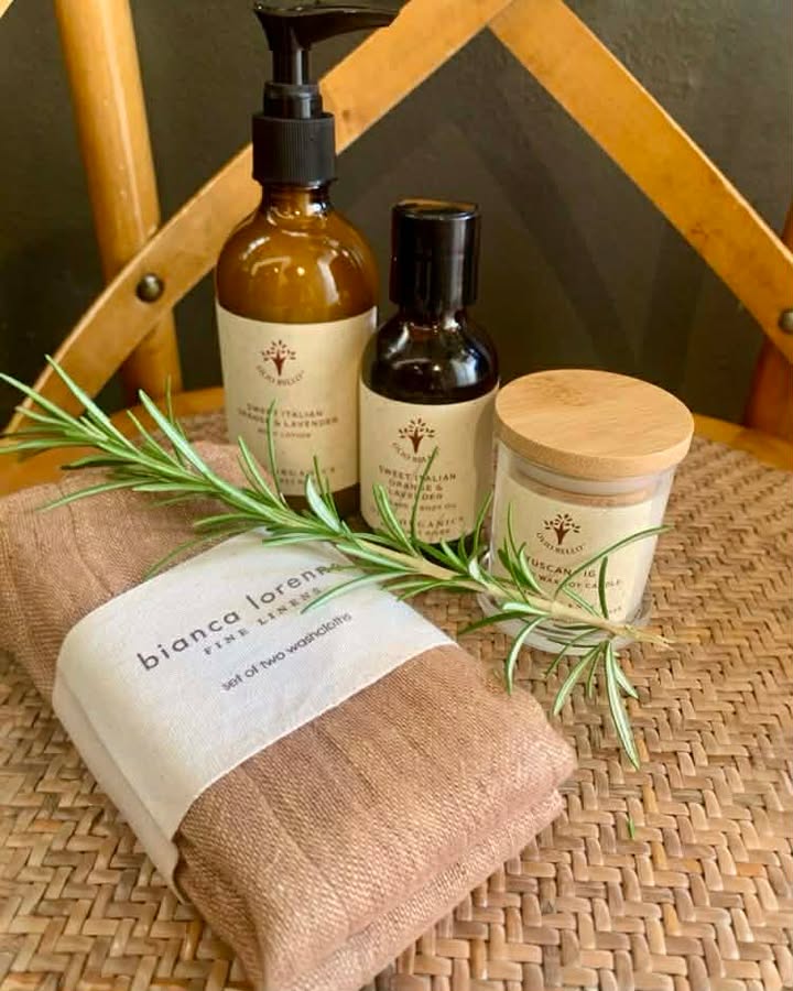 Take a little piece of Tuscany and Olio Bello. home - with this luxurious and pampering 'Home Spa Pack' from our Olio Organics range. Featuring three unique products hand made at the farm and a stylish Bianca Lorenne' Fine Linen set of Facecloths. This pack is the ideal gift for a loved one, or self and offers a nurturing and calming 'Tuscan inspired' - home spa experience.